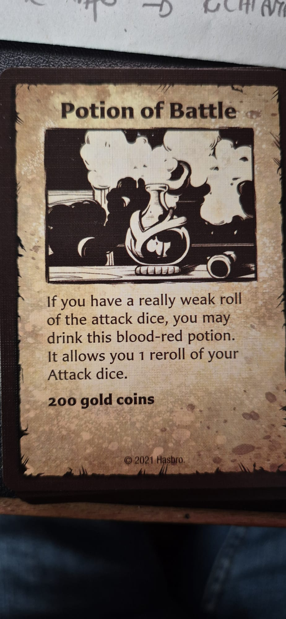 jo.albo Posted November 10 Group: Membri Topic Count: 15 Content Count: 368 Reputation: 659 Achievement Points: 418 Days Won: 65 Joined: 10/27/2018 Status: Offline Last Seen: 8 hours ago Posted November 10 5 ore fa, legolas777 ha scritto: Ma quali maestrini...se tu leggessi bene quello che uno scrive, invece di criticare.....La rocca e il ritorno sono corretti per la pozione di battaglia. Si vede che l'inglese lo conosci poco. E non sono nathan: ma chi è? Non diamo ulteriori colpe ad Hasbro Italia, per favore, già ne ha abbastanza. Profezia di Telor, te la faccio ingradita l'immagine, così leggi bene la differenza con Rocca e Ritorno: Questa immagine da dove viene? Le carte che ti ho messo su, sono di Kellar e Stregoni ed è scritto che si possono ritirare i dadi. It allows you 1 reroll of Attack dice. In altri termini puoi ritirare tutti i dadi di attacco 1 volta. Le carte in italiano di Kellar e Stregoni dicono invece di ritirare 1 solo dado non TUTTI I DADI di attacco. Dove avrei sbagliato in inglese? Sentiamo sono curioso. Conan 75 1